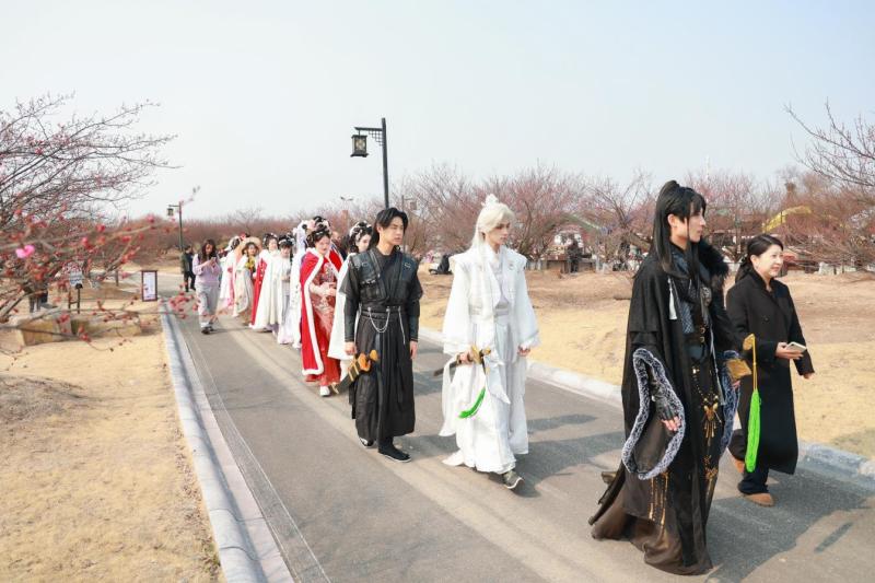 玄甲将军斗篷飞扬,红裙女神落英起舞,巡游队伍所到之处人潮涌动。游客争相与“钟离眜将军”击掌互动,小朋友追着“梅花女神”讨要花瓣,现场欢笑声不断。上百名游客换上汉服,化身楚汉传奇人物,在梅林中演绎“武侠剧照”名场面,仿佛一秒穿越回热血江湖。