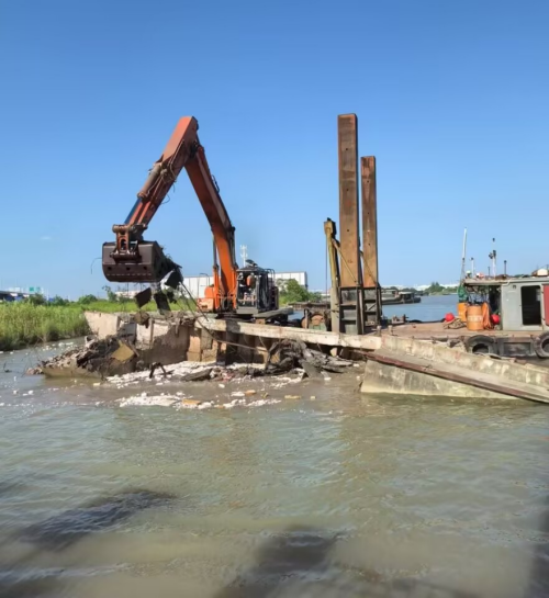 在通州湾港区疏港航道,作业人员发现一艘已部分沉没、部分搁浅的无主废弃水泥船,存在明显安全隐患。清理团队对船体进行现场切割与拆解,并对散落构件进行打捞清运。施工期间,现场部署警戒船舶实施全程值守,实时监控周边船舶动态,有力保障了作业安全。
