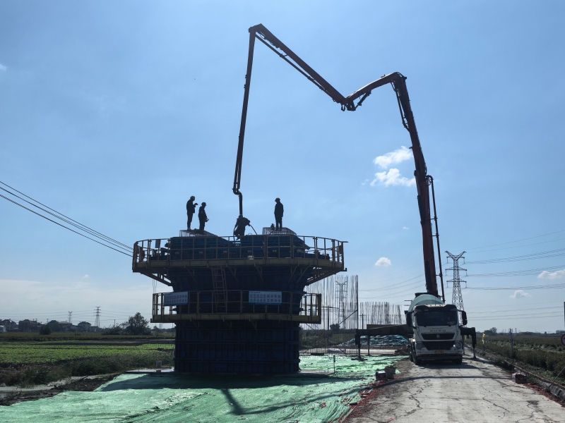 盐宜铁路花沈村特大桥位于江苏省泰州市兴化市境内,全长5559.76m,共有钻孔桩1526根,墩身167个,连续梁5联。该桥多次上跨地方重要道路和河流,施工期间安全管控风险高,环水保要求严。本次施工的花沈村特大桥125号墩,墩高6.5米,采用定型钢模,一次浇筑成型,设计混凝土量92.45立方米。