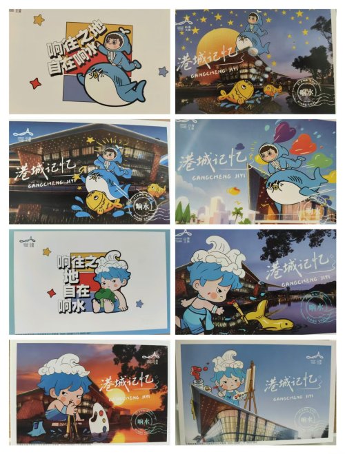 系列明信片中,两大IP形象格外吸睛。“蓝海豚 + 萌娃” 组合里,灵动可爱的海豚搭配身着海洋风服饰的萌娃,仿佛在蓝色山海间自在穿梭,呼应着响水依水而兴的地域特质;“云顶萌娃” 形象则童趣十足,头顶云朵造型的萌娃或执画笔勾勒港城盛景,或于山水间肆意玩耍,将响水的人文艺术与自然灵韵巧妙串联。这些IP深度提炼响水文旅的核心基因,以年轻化、趣味化的设计语言打破传统明信片的刻板印象,既能让本地居民唤起乡愁共鸣,也能让外地游客一眼记住响水的“萌系”魅力。