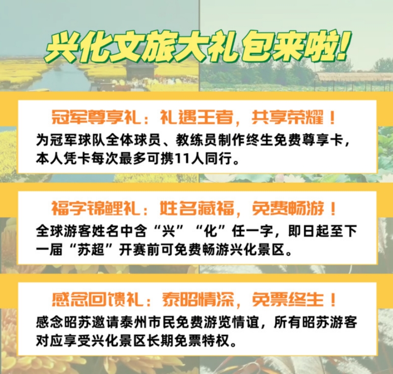 借势“苏超”联赛热潮,在泰州队闯入决赛后,兴化文旅率先宣布“无论输赢,全球免费”。泰州队夺冠后,更是迅速推出“免门票+超值福利+特惠蟹宴”的组合拳,将全民的观赛热情无缝转化为旅游消费冲动,实现了景区人流与消费额的显著双增长。