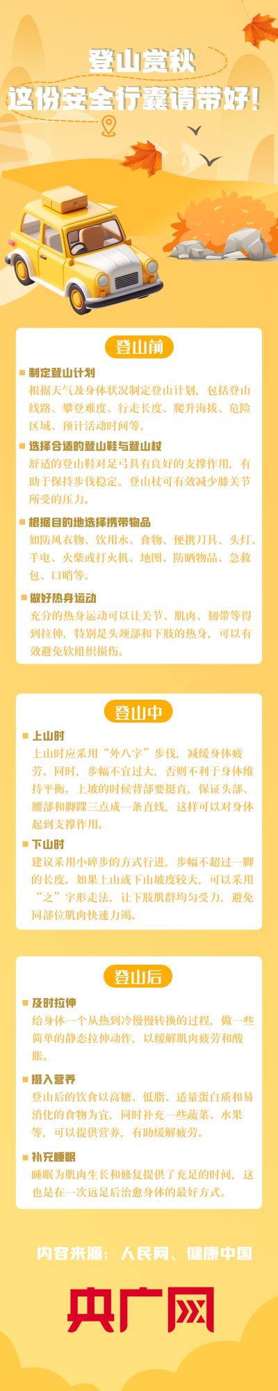 金秋时节,山色如画,正是登高赏景的最佳季节。一场安全又尽兴的登山之旅,离不开周全的准备——您的“安全行囊”已就位,速来领取!戳下图↓