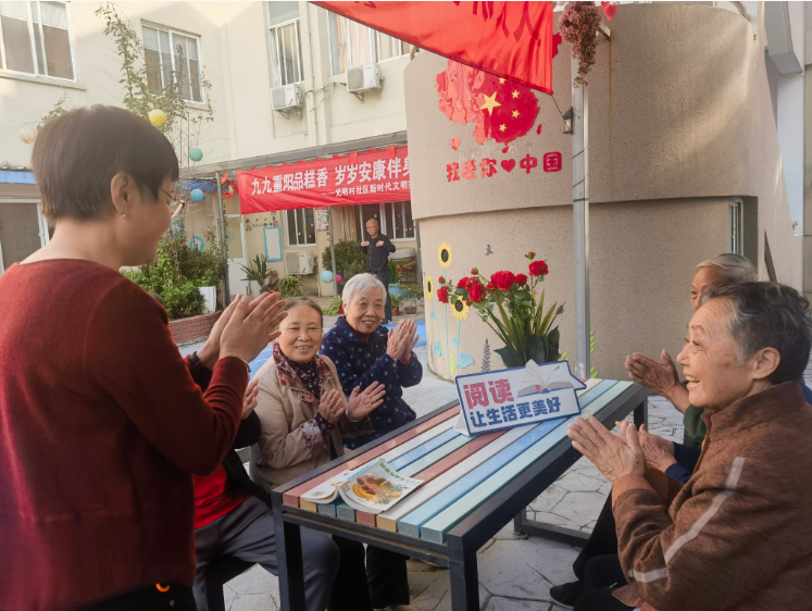 金秋送爽,菊香满溢。重阳节来临之际,光明村社区枫林养老院内暖意融融,一场以“菊香伴书语 敬老话安康”为主题的阅读分享活动在此开展,志愿者们携书籍《健康与养生》,为老人们带来别样的温暖。
