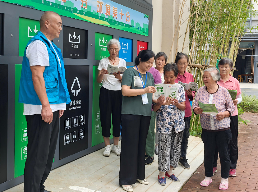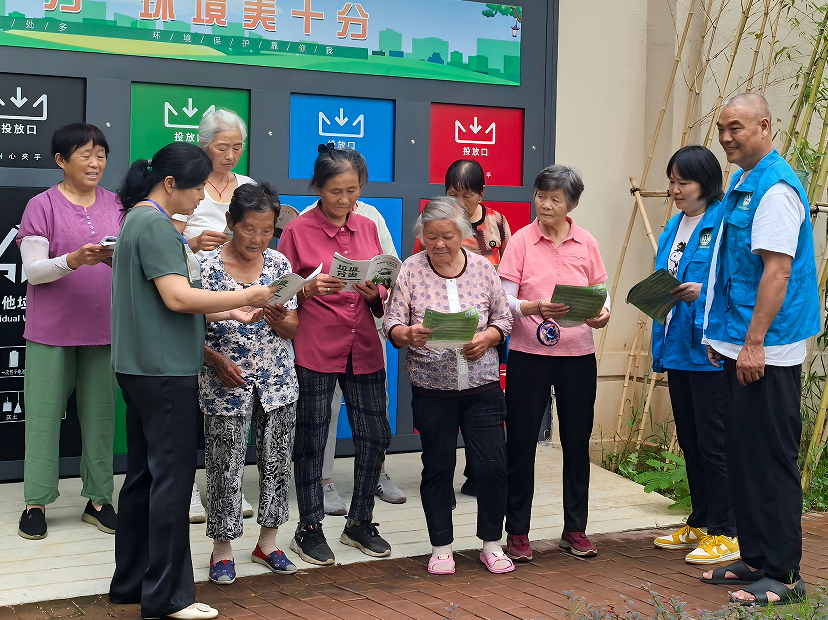 活动现场以“临江苑环保屋”为实践阵地,这座标有“垃圾分一分,环境美十分”标语的绿色建筑前,志愿者们身着统一蓝色马甲,向居民发放《垃圾分类操作手册》《环保知识读本》等定制读物。现场特别设置“分类知识角”,志愿者通过实物演示讲解四色垃圾桶对应投放标准:绿色厨余、黑色其他、蓝色可回收、红色有害,并针对老年群体常见误区进行重点答疑。在互动体验区,志愿者与居民围坐共读《生态中国》选段,结合书中案例剖析垃圾分类对碳减排的直接贡献。干民兵则承担起秩序维护与重物搬运工作,保障活动顺畅进行。