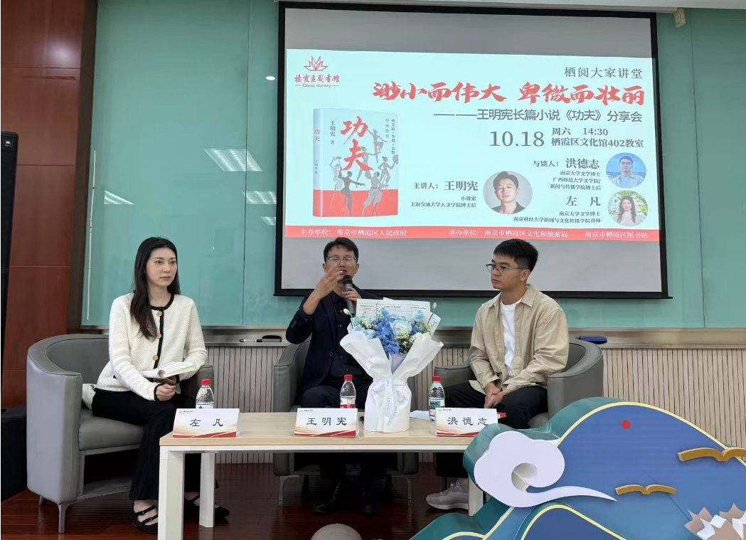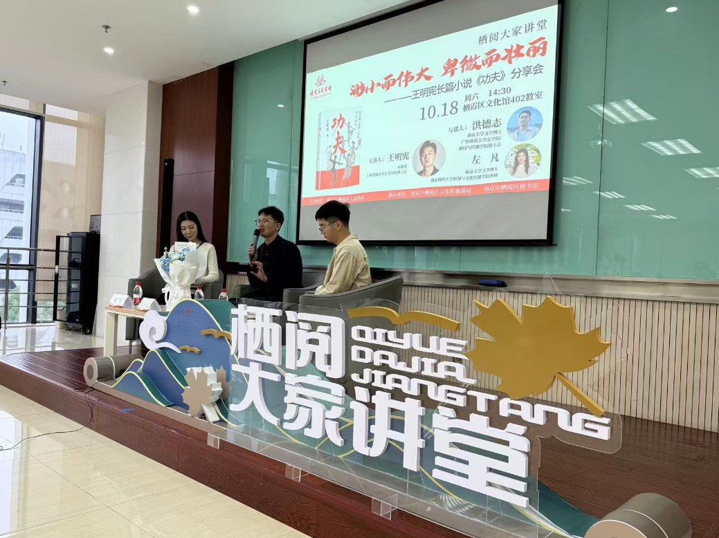10月18日,小说家、上海交通大学人文学院博士后王明宪携长篇小说新作《功夫》走进栖霞区“栖阅大家讲堂”活动,与广西师范大学文学院新闻与传播学院博士后洪德志、南京财经大学新闻与文化传播学院讲师左凡一起,以“渺小而伟大,卑微而壮丽”为主题,为读者带来一场精彩的分享会。