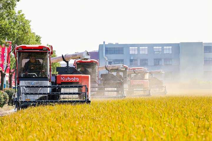 风吹稻浪,遍地铺金。在沿海农发宜兴和桥万亩水稻基地上,金灿灿的稻田犹如一张张色彩斑斓的织锦,勾勒出一幅幅仓廪充实的壮美“丰”景画,处处洋溢着“稻花香里‘鹤’丰年”的喜人景象。10月22日,伴随农业机械的阵阵轰鸣,2025年“鹤丰年”水稻季正式开镰。省农业农村厅、宜兴市政府、省沿海集团、和桥镇政府及当地企业相关领导、嘉宾应邀参加开镰活动。