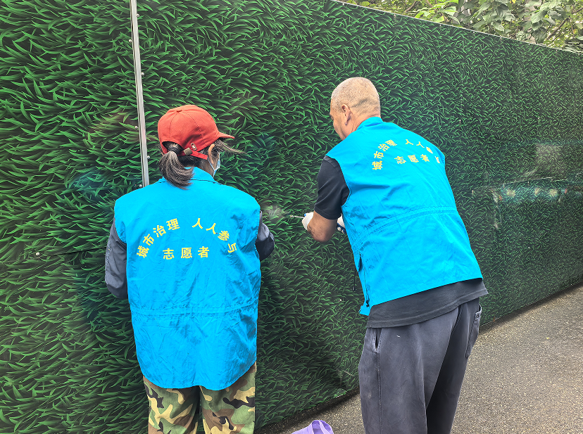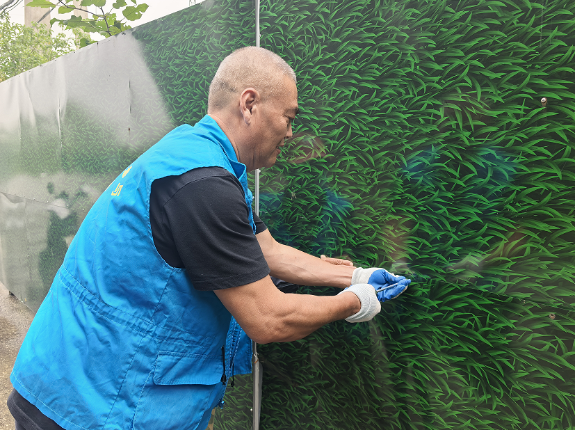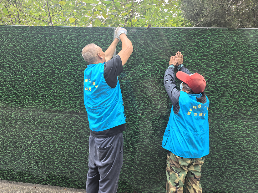 经过数小时协作,原本破损的围挡焕然一新:绿色仿真草皮严密覆盖金属框架,破损缝隙被专业材料封堵,整体结构稳固美观。此次维修不仅消除了安全隐患,更提升辖区环境品质,实现安全与美观的双重提升。