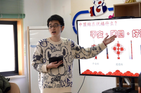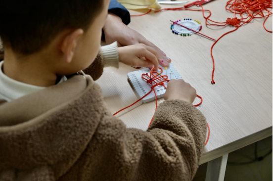 最后,在教学视频的引导下,孩子们开启了中国结手工制作环节。在志愿者的耐心协助下,一根根红绳在孩子们的指尖交错缠绕、逐渐成形。尽管制作过程需要耐心与专注,但孩子们始终兴致盎然、互相帮助,最终完成了属于自己的中国结作品。看着亲手制作的成果,孩子们脸上洋溢着自豪与喜悦。