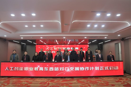 在全体参会人员的倒数声中,南京信息职业技术学院、青海职业技术大学、南京工业职业技术大学、南京交通职业技术学院、江苏农林职业技术学院、南京铁道职业技术学院、西藏职业技术学院、新疆生产建设兵团兴新职业技术学院、阿克苏职业技术学院、北京华晟经世等18家东西部院校及企业代表共同登台,正式启动“人工智能职业教育东西部对口支援协作计划”。首批参与院校覆盖江苏、浙江、重庆、青海、新疆、西藏等多个地区,构建起结对协作新格局,标志着东西部职业院校在人工智能职业教育领域的协同发展正式拉开序幕。