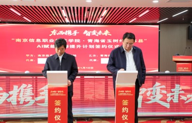 启动仪式最后环节,教育部职成司援青干部(青海省玉树藏族自治州治多县委副书记、副县长)刘俊与孔捷共同签署“南京信息职业技术学院·青海省玉树州治多县”AI赋能教师提升计划合作协议,标志着东西部协作从资源共建向人才共育纵深推进。