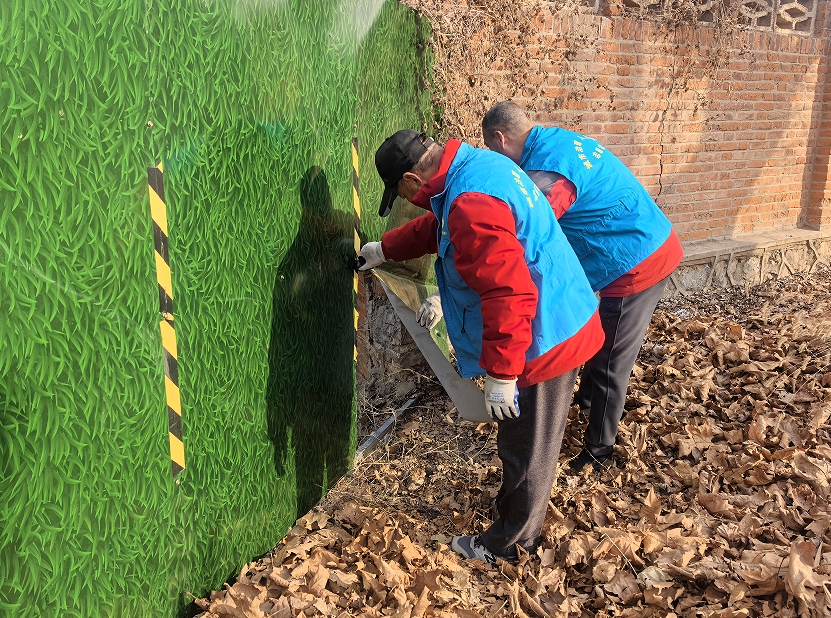 整个维修过程持续数小时,尽管天气微寒,地面铺满落叶,但志愿者们始终专注投入,不放过任何一个细节。最终,原本破败不堪的围挡焕然一新——绿色仿真草皮严密覆盖金属框架,缝隙被彻底封堵,整体结构牢固可靠,既提升了安全性,也显著改善了周边环境品质。