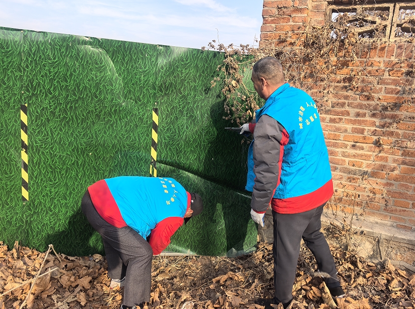 维修现场位于一条村道旁,原本用于隔离施工区域的绿色围挡因长期风吹日晒及人为因素影响,中间偏右位置出现明显缝隙,部分金属框架裸露在外,不仅影响市容环境,更可能引发行人误入或物品坠落等安全事故。面对这一情况,阅山社区城治委第一时间协调资源,组建专项维修队伍。两名身穿蓝色志愿者马甲的工作人员立即投入工作。他们分工明确、配合默契:一人负责清理破损边缘的杂物与锈迹,另一人则使用专业工具对金属框架进行加固,并用高强度封边材料严密封堵缝隙。同时,他们将新的仿真草皮精准铺设于围挡表面,确保整体结构稳固、外观整洁美观。