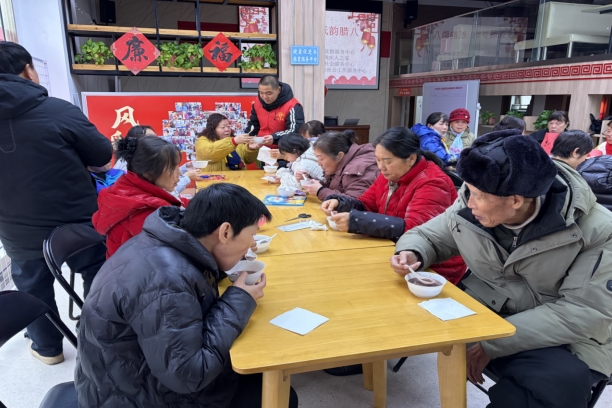 另一边的腊八粥品鉴区同样暖意升腾,工作人员与志愿者早早便备好糯米、红豆、红枣、桂圆、莲子、花生等十余种食材,以文火慢炖数小时。咕嘟冒泡的粥锅旁,香甜醇厚的气息弥漫整个活动室,勾得人食指大动。志愿者们小心翼翼地将一碗碗热气腾腾、软糯香甜的腊八粥送到居民手中,轻声叮嘱大家注意保暖。一碗碗热粥驱散了冬日的寒意,一声声问候传递着真切的关怀,居民朋友们的脸上都洋溢着幸福满足的笑容,暖意从舌尖蔓延至心底。