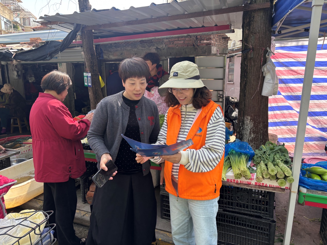长江新村社区网格员向小菜场摊主、过往居民以及商户工作人员发放网络安全宣传资料,详细讲解如何抵制网络谣言、预防个人信息泄露等常见网络安全问题。通过列举贴近生活的典型案例,大家直观了解网络安全风险,提升辨别能力。