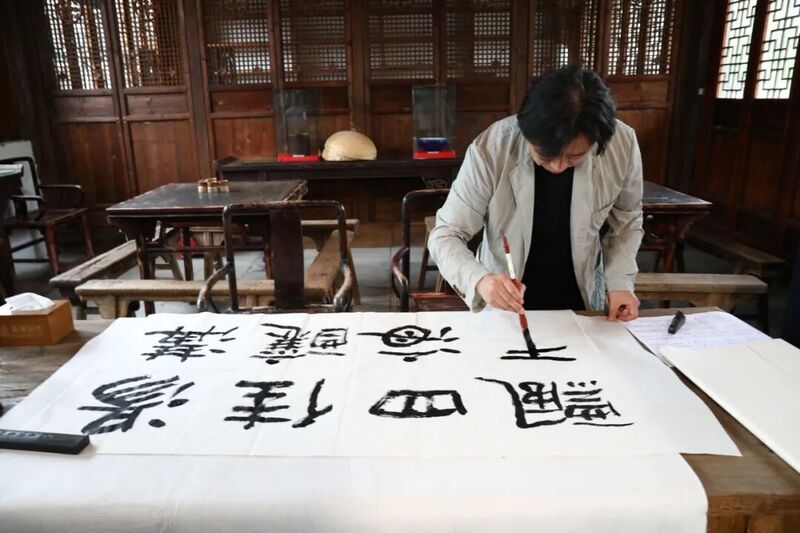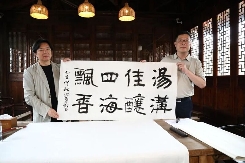 玉生糟坊内,嘉宾们围坐品鉴汤沟美酒,汤沟酒“幽兰陈香、入口柔顺、饮中愉悦、饮后舒适”的独特风格,获得声声赞誉。管峻院长兴致盎然,现场挥毫写下“汤沟佳酿・四海飘香”,笔墨遒劲有力,既是对汤沟匠心精神的礼赞,更是对汤沟酒卓越品质的肯定。
