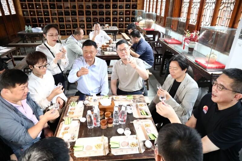 在朱耀汇董事长的引领下,嘉宾们先后参观了汤沟酒文化展示中心、酿酒车间、手工班窖池群、玉生糟坊、天启酒窖、香泉井等,实地感受“源于先秦,中兴北宋,盛于明清”的厚重历史,亲身体验中华传统酿造工艺的独特魅力,深刻领略“南国汤沟酒,开坛十里香”的绝妙风味,开启了一场沉浸式的酒文化体验之旅。