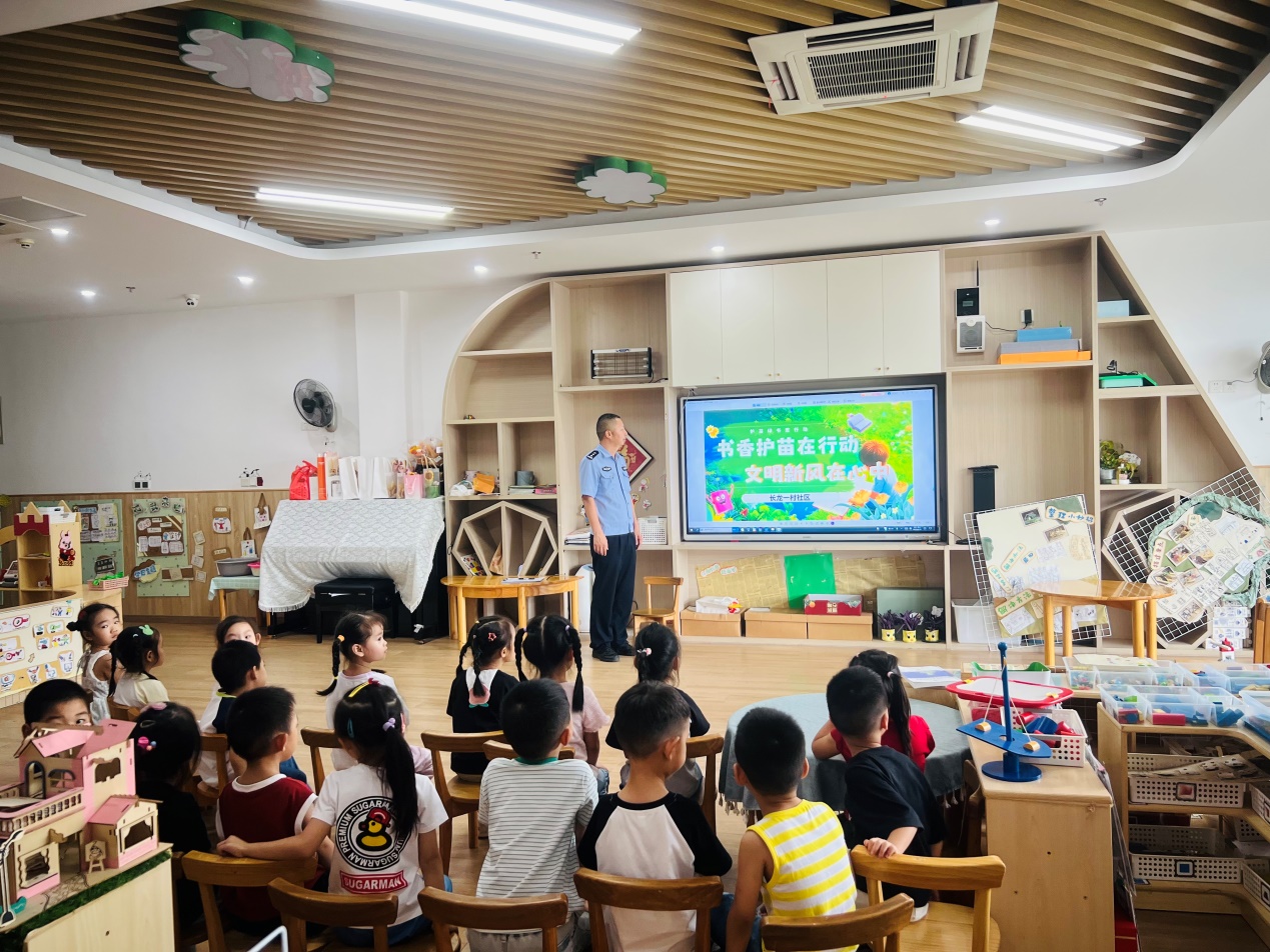 长龙一村社区在慕卿幼儿园开展“护苗•绿书签” 行动。活动中,社区民警化身“护苗宣讲员”,通过图文并茂、生动有趣的讲解和互动问答向青少年详细解读“绿书签”行动的重要意义。陆警官结合近期典型案例深入浅出地普及了版权保护、网络安全等知识,教导同学们如何辨别盗版书籍和不良网络信息,自觉远离有害文化侵蚀。同学们全神贯注,积极互动,现场学习氛围浓厚。