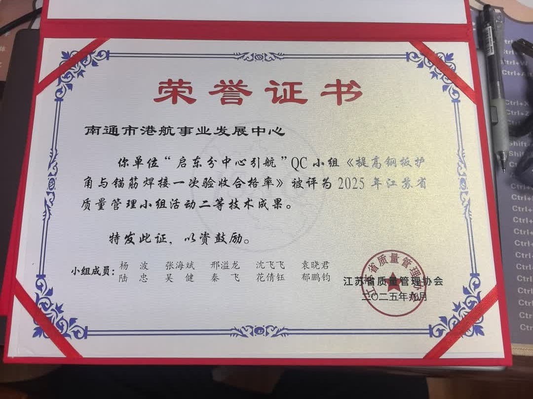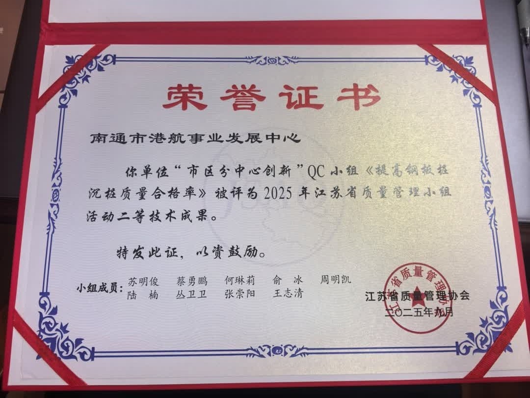 近日,从江苏省质量管理协会传来捷报,南通市港航事业发展中心QC成果再创佳绩,“市区分中心创新”QC小组凭借《提高钢板桩沉桩质量合格率》课题、“启东分中心引航”QC小组凭借《提高钢板护角与锚筋焊接一次验收合格率》课题,双双斩获2025年江苏省质量管理小组活动二等技术成果,再次彰显了南通港航在技术创新与质量管理方面的卓越实力。