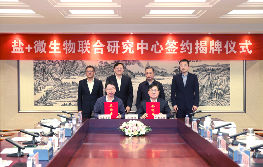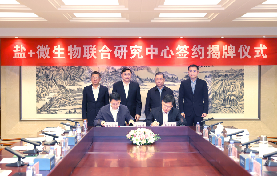 会上,李耀强与陈卫共同为“盐+微生物联合研究中心”揭牌。中盐金坛公司党委副书记、总经理钮永涛与江南大学食品科学与资源挖掘全国重点实验室常务副主任、食品学院副院长翟齐啸教授签署合作协议。
