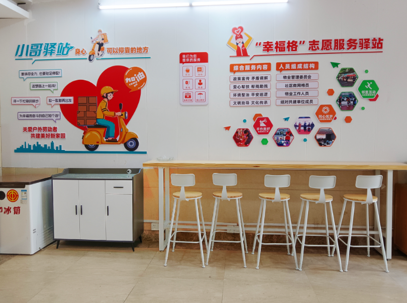 “暖心”主驿站(社区党群服务中心)作为服务功能的“集大成者”,不仅提供饮水、热饭、充电、休憩、应急药箱、免费 Wi-Fi 等基础服务,还设立了读书角、政策咨询窗口,由社区党员和志愿者提供引导帮助,营造出“家”一般的全方位温暖体验;而“便捷”服务点(物业管理工作站)作为服务阵地的有效延伸,更侧重灵活即时的服务,聚焦临时歇脚、电瓶换电、应急避雨、工具共享等高频需求,真正将服务送到新就业群体工作的“最后一百米”,实现“服务随时在身边”的便捷目标。