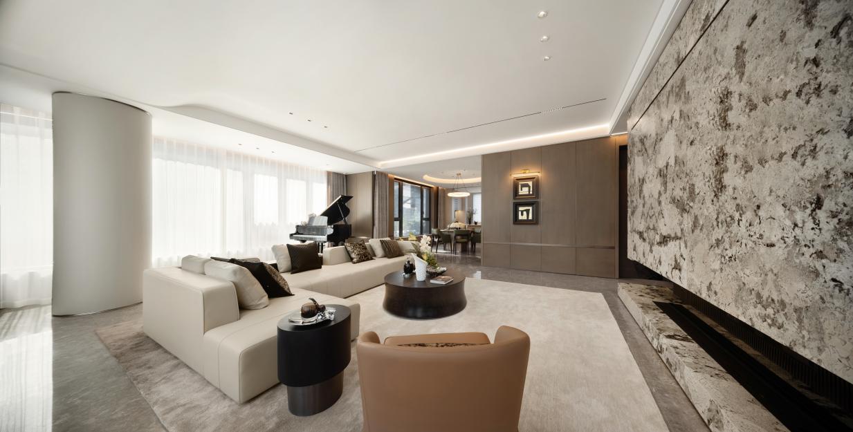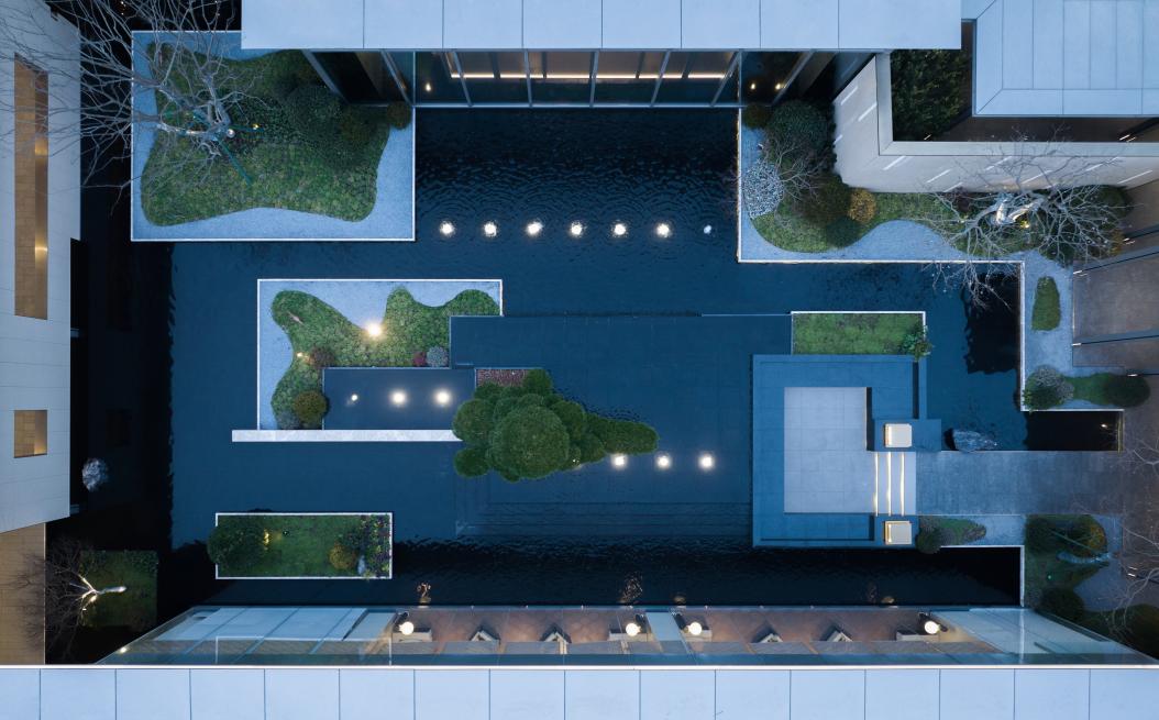 除了注重与自然环境和谐共生的理念,住宅空间品质的提升,离不开对地域文脉的深度融合。苏州天熠东方项目作为独墅湖核心月亮湾新地标,以现代极简风格打造建筑立面,大面积铝板幕墙搭配绿如蓝陶板镶嵌,再加上0.48的高窗墙比设计,让南北立面呈现出镜面般的通透质感。社区景观则以“引水琢玉”为核心,通过“两轴八园八景”架构,将苏州水韵与玉文化融入归家动线,每一步都像是穿越姑苏文脉的沉浸式体验。
