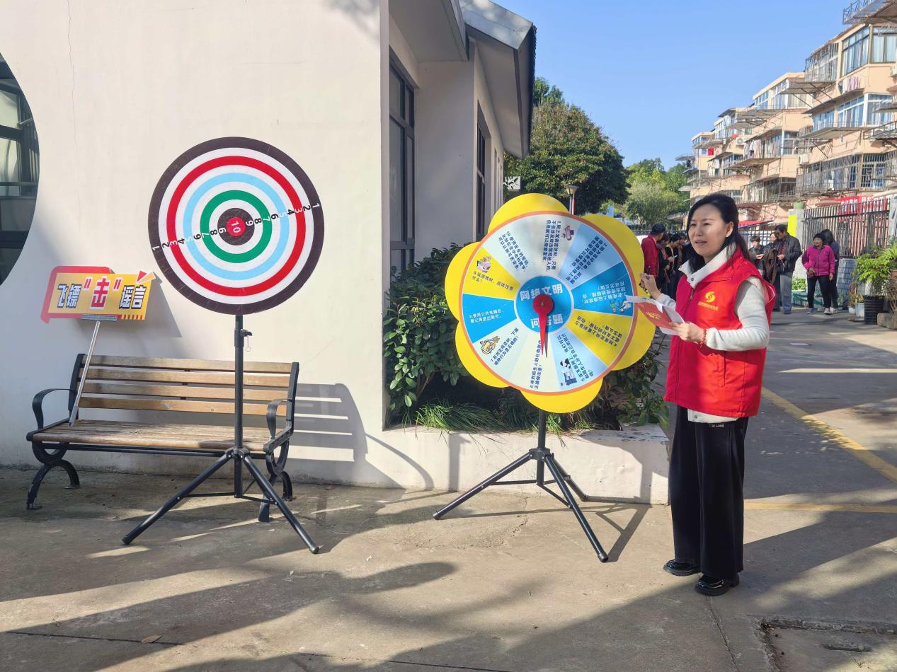 飞镖“击”谣言区域更是吸引了众多居民的注意力。飞镖上每一环都对应着一个网络谣言的相关问题。参与者手持飞镖,瞄准投掷,根据飞镖命中区域回答相应问题,击破谣言;滚铁圈竞赛中,两两一组推动铁环沿路线滚动,途中推倒标有“不良信息”“网络暴力”等标语,象征着清楚生活中的网络不良信息,让居民在趣味游戏的过程中学习辨别网络谣言、抵制网络谣言,共同守护清朗网络空间。