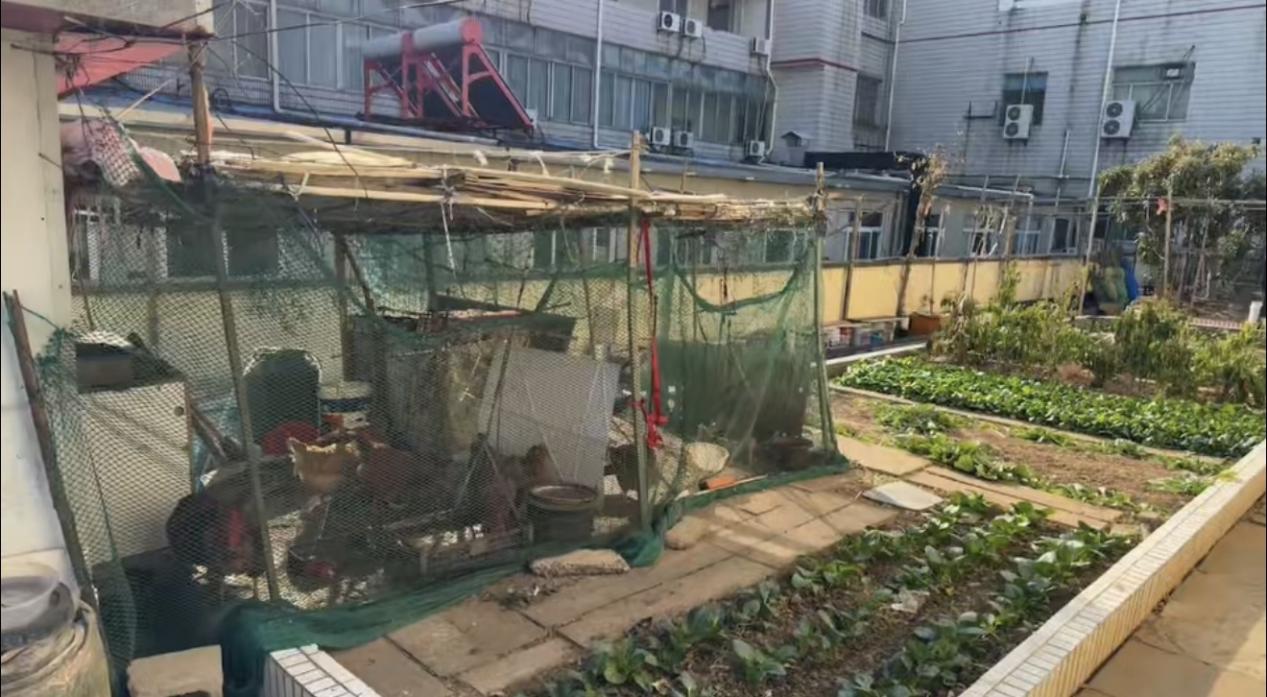 老金鹰广场始建于上世纪90年代,是典型的商住两用楼,房型结构独具特点:一二层为商铺,三层是面积约1000平方米的大型公共平台(平台内规划多个绿化带),三至七层为居民住宅楼。然而,由于长期缺乏规范的物业管护,这一特殊房型逐渐暴露出诸多治理隐患。平台绿化带内杂草肆意疯长,部分居民擅自毁绿种菜、搭棚养鸡,废旧家具、建材废料、生活垃圾等杂物随意堆积,不仅严重破坏了城市风貌与公共空间属性,更潜藏着火灾蔓延、蚊虫滋生、物品坠落等多重安全风险,长期困扰周边居民日常生活,成为辖区基层治理的“老大难”问题。