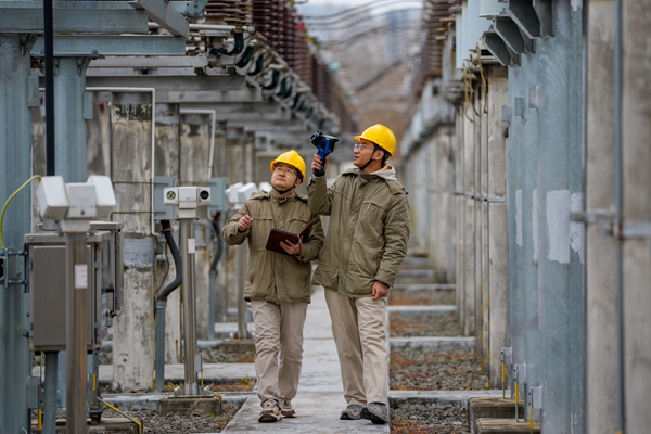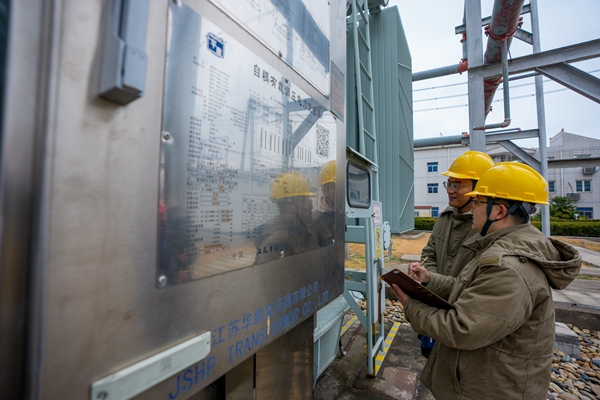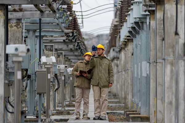 1月19日,国网南京供电公司变电运维人员在220千伏殷巷变开展测温巡视工作,确保电网设备安全运行。