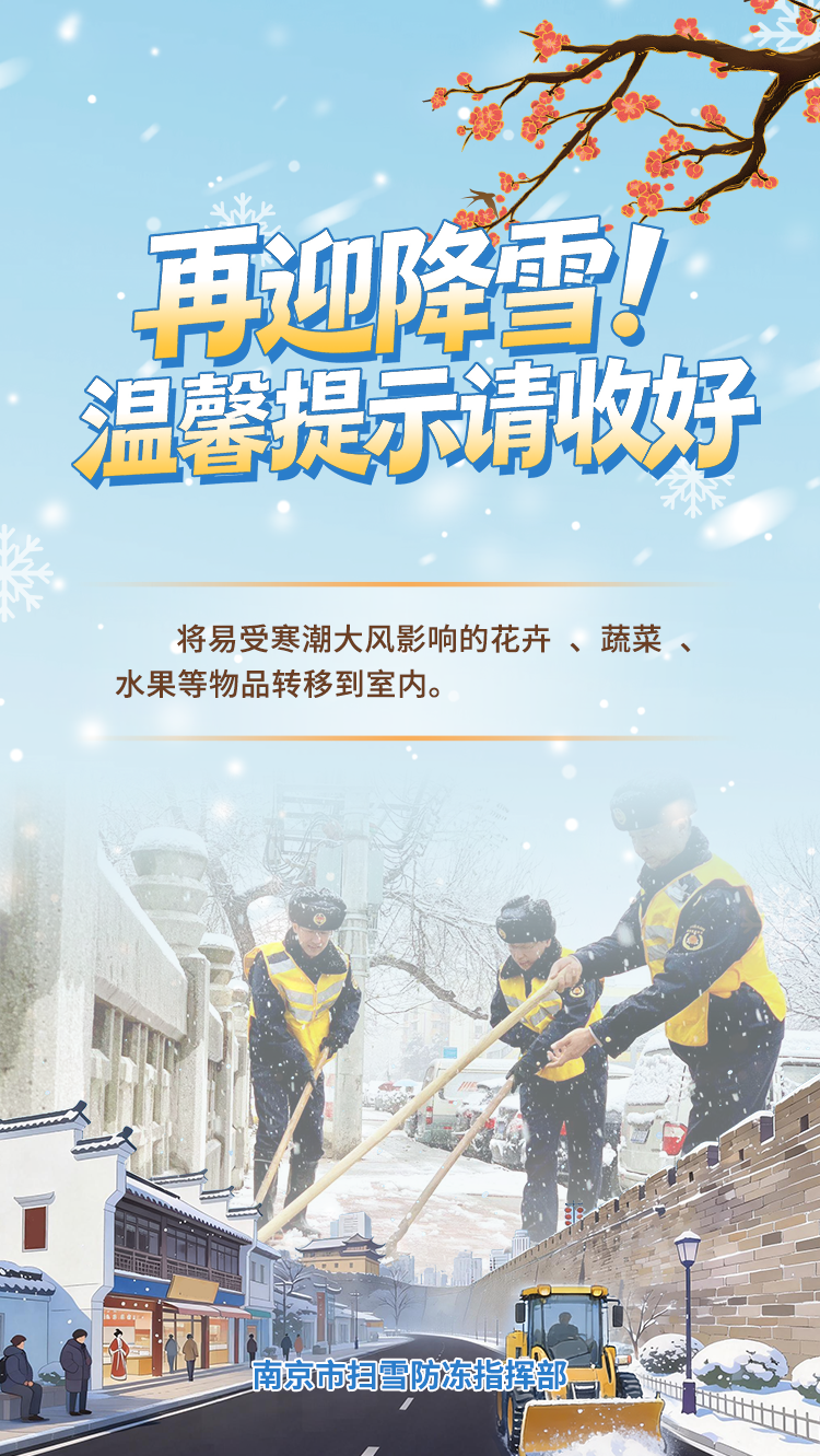 面对寒潮雨雪天气,南京市扫雪防冻指挥部提前启动应急响应,全力保障城市正常运转和市民安全。同时提醒市民:
