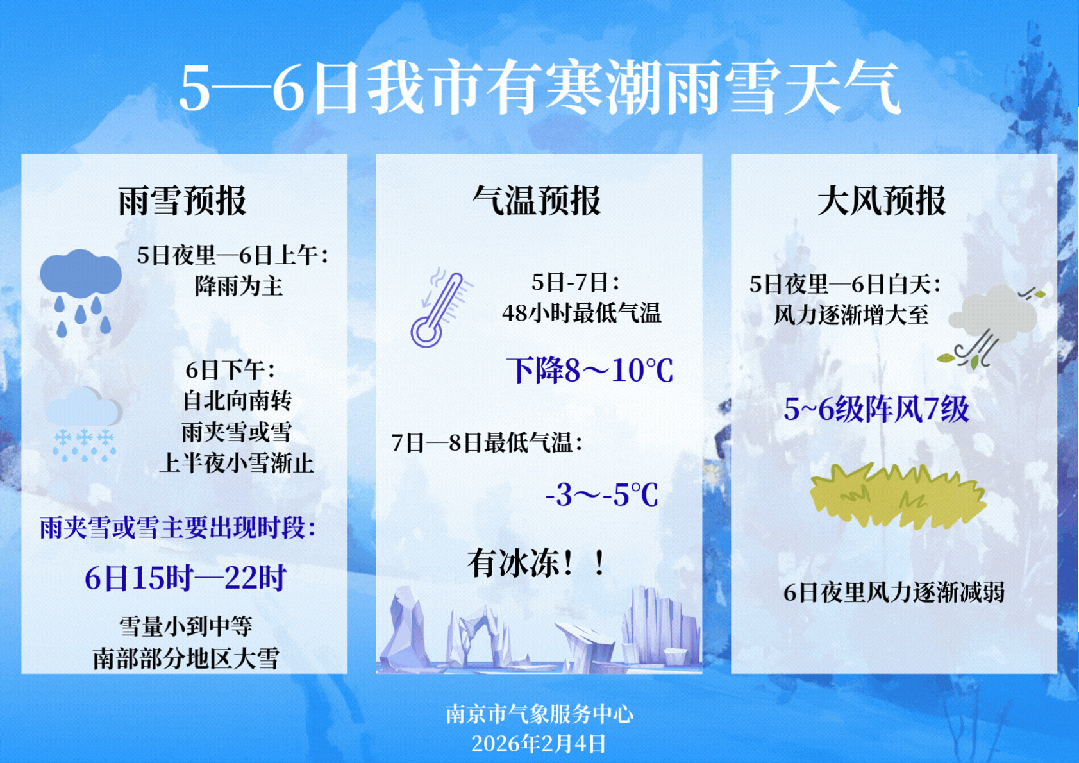 南京的雪又来啦!受强冷空气南下影响,南京自2月5日夜间起迎来大风、降温和雨雪“三重暴击”。市气象台数据显示,2月6日下午起自北向南转雨夹雪或雪,部分地区将出现大雪,7-8日最低气温跌至-3~-5℃并伴有冰冻,此次天气过程对市民出行、城市运行带来一定影响。