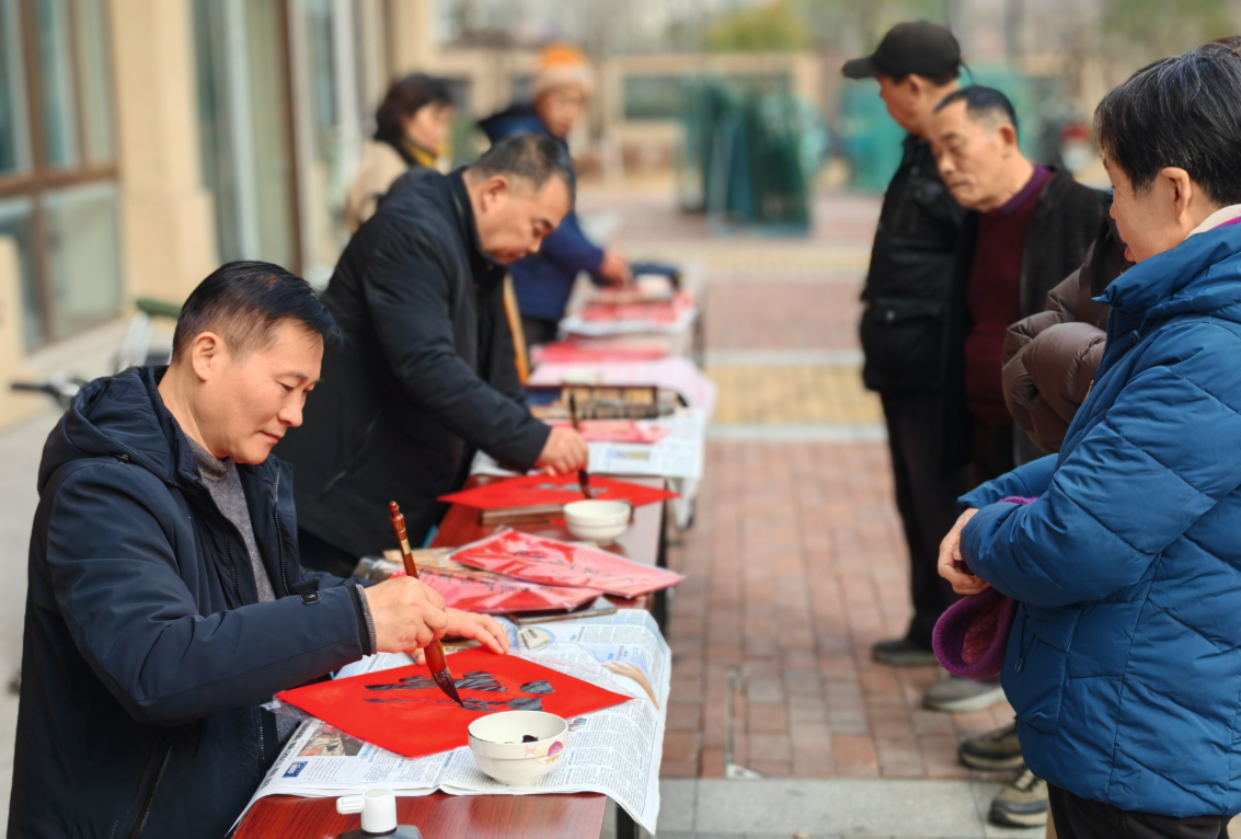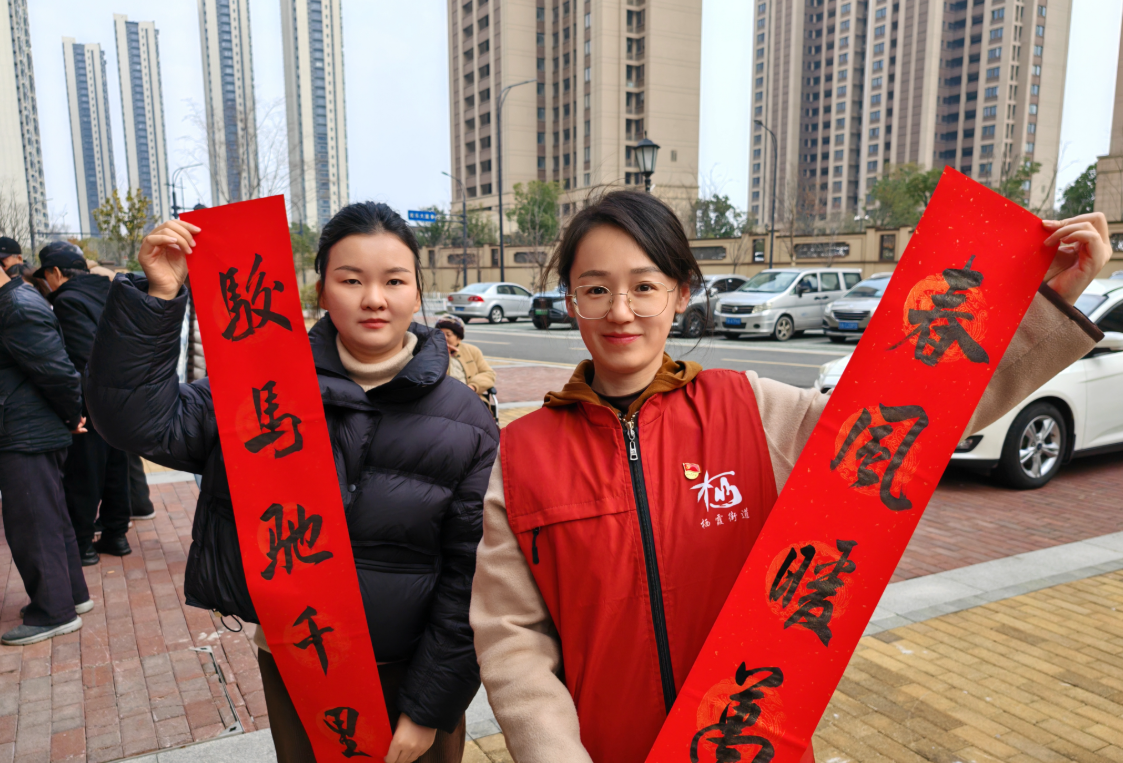 活动现场暖意融融,年味十足。长桌上铺展着鲜红的宣纸,墨香在微风中淡淡弥散,书法志愿者们凝神聚气、提笔挥毫,或行云流水,或端庄厚重,一副副寓意吉祥、辞旧迎新的春联和一个个形态各异、饱含祝福的“福”字陆续完成。“门迎百福福星照,户纳千祥祥云腾”“天增岁月人增寿,春满乾坤福满门”……一句句经典对联承载着对美好生活的向往,也传递着邻里守望的温情。