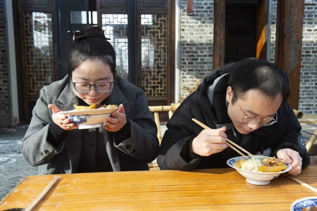 在公众号留过言的游客,都在“虾小宝”摊位前排起了队。大铁锅柴火烧得噼啪响,红烧黑猪肉的香气老远就能闻到。领到饭菜的游客坐在小院里,吃得格外香甜。“这柴火饭,让我想起外婆家的味道。”95后游客小张边吃边拍照发朋友圈。