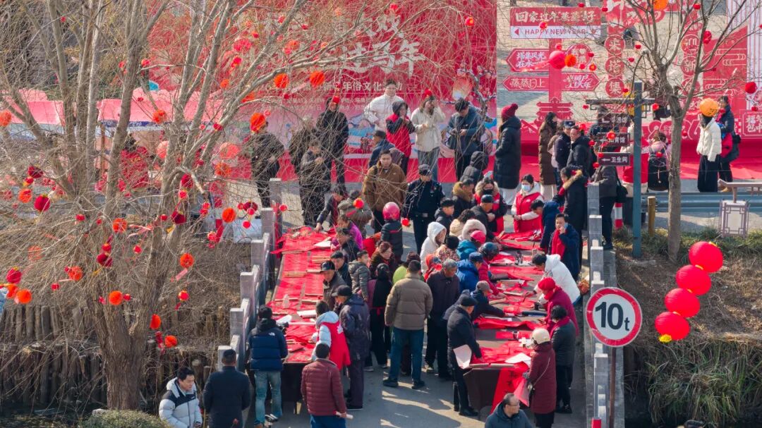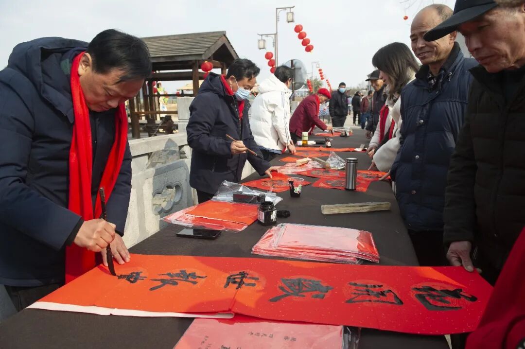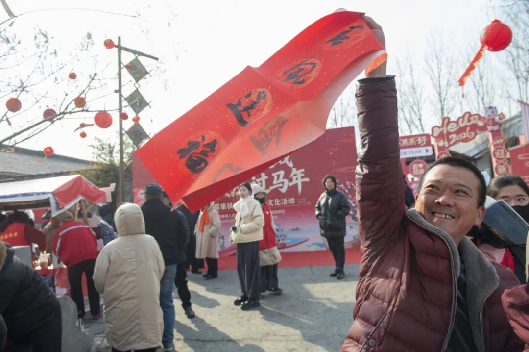 隔壁书法区也排起长队,红纸铺开,墨香扑鼻,一副副饱含着美好祝福的春联和一张张圆润饱满的福字在笔尖流淌,村民和游客有序排着队,精心挑选最合意的词句。
