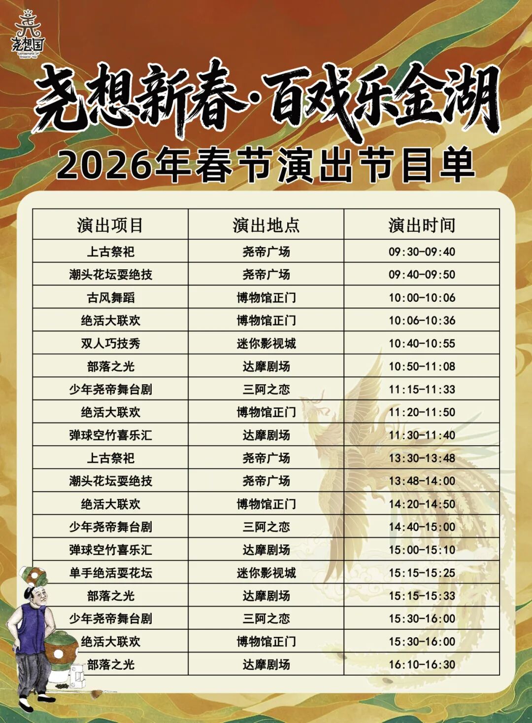 亮点抢先看:以非遗民俗为核心,一站式解锁“赏百戏、逛尧城、赢银票、品美食、祈新福”的新春体验。活动邀请江苏省杂技团呈现“百戏”非遗展演,设有美食市集、非遗手作工坊、NPC互动,搭配相关主题展演及“尧帝福票”(可抵扣消费),彰显尧文化与非遗魅力,丰富新春文旅体验。