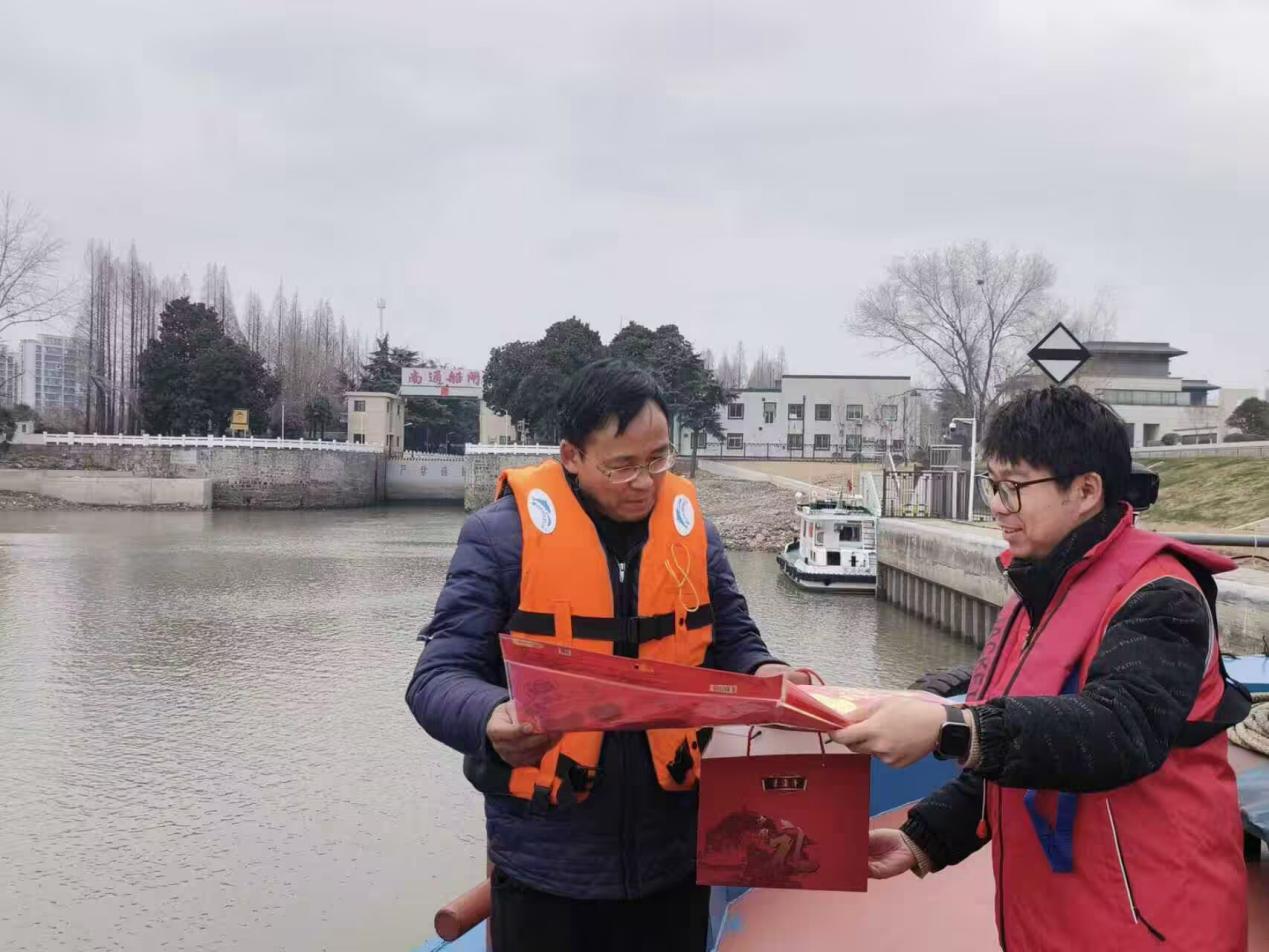 2月10日,南通市港航事业发展中心在九圩港船闸上游引航道,组织干部职工开展“迎春送福,岁暖航程”主题活动,为常年奔波在水运一线上的船员送上新春祝福与暖心年货。焦港船闸、南通船闸同步开展新春送福志愿活动,让蜿蜒的水道成为传递温暖的“亲情航道”。