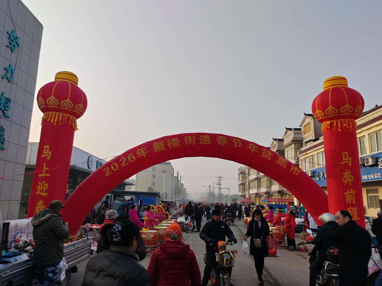 农历马年脚步渐近,淮安市金湖县戴楼街道的年味已扑鼻而来。2月11日,育才路两旁的灯笼高挂、彩旗飘飘,“2026年戴楼街道春节年货集市”在冬日暖阳中热闹开张。热气从早点摊飘散,欢声随人流涌动,一场融合“买年货、找工作、品文化、询法律”的新春嘉年华,正将暖暖的烟火气与实实在在的便民服务,铺展成街头最生动的年景。