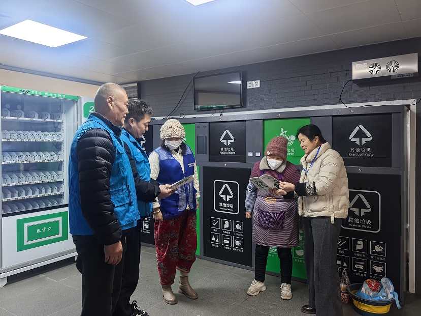 在互动环节中,一位年长居民拿着装有混合垃圾的容器前来咨询,志愿者立即上前查看,逐项指出其中应归类的物品,并现场示范如何进行精准投放。通过“一对一”的指导服务,有效解决了居民在实际生活中常遇到的分类难题。同时,活动还特别安排了阅读分享环节,鼓励大家在阅读环保书籍的过程中汲取绿色理念,从思想上树立节约资源、保护环境的责任感。