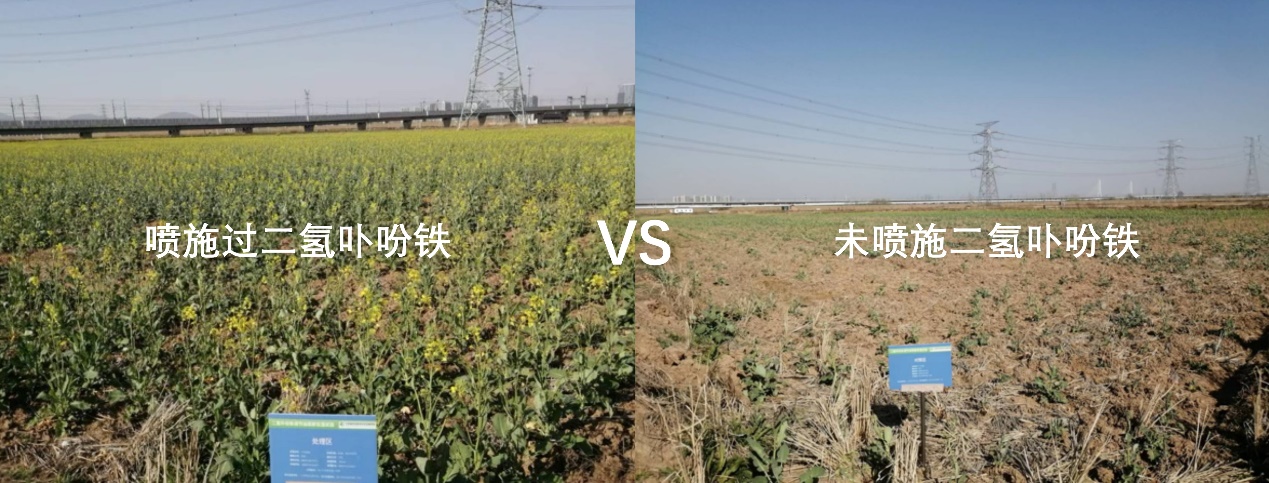 在油菜上的应用数据显示,使用二氢卟吩铁后,油菜分枝数增加,下部原本光照不足的分枝也能正常开花结荚,荚果数增多,亩产普遍增产8%—10%,折合50至150斤。更关键的是,油菜籽中的芥酸含量显著降低,油品更健康。