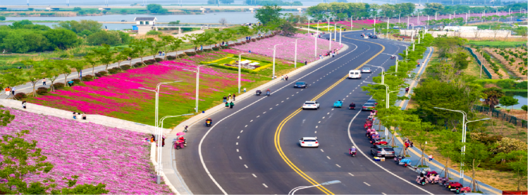 从金湖县城出发,驶过金湖大桥,沿着淮河入江水道一路向前,水声相伴,风景相随,即刻抵达十里果林。
