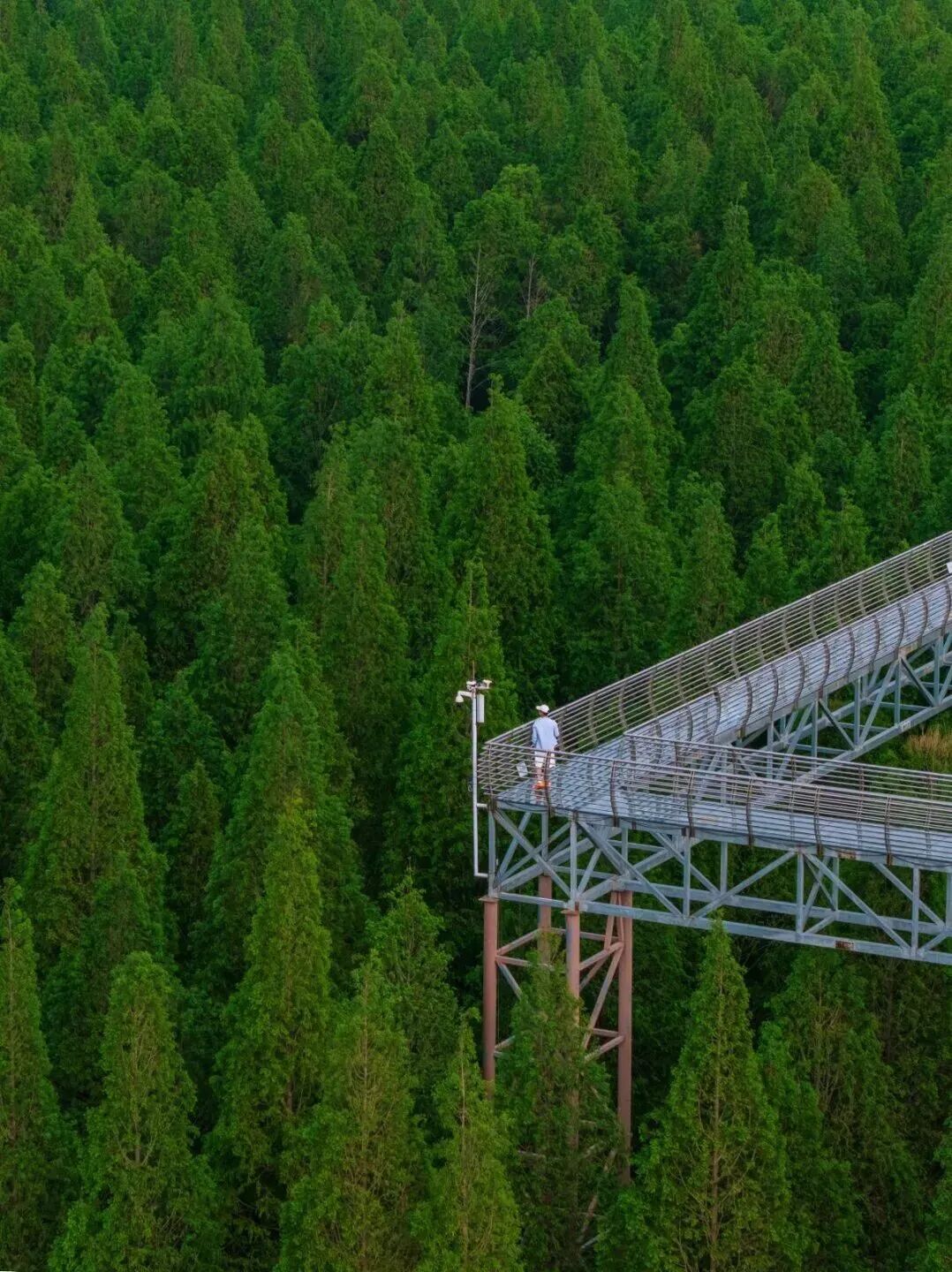 走进水上森林,仿佛走进了绿野仙踪。五一时节,水杉褪去冬日的沉寂,换上了层层叠叠的新绿。阳光透过嫩绿的杉叶,洒下斑驳的光影,整片森林被清新的绿意笼罩,满目葱茏,生机盎然。