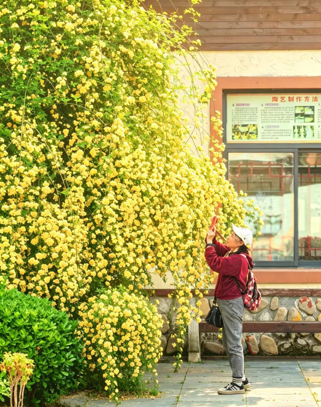 走进尧想国文旅区,了解尧帝文化,感受中华文明的源头。月季花开娇艳,色彩缤纷;月见草粉色的花瓣轻盈柔软,在微风中轻轻摇曳,宛如月光下的精灵;黄木香爬满花架,密密匝匝的黄色小花如瀑布般倾泻而下,芬芳馥郁。水,滋养了这片土地,也孕育了上古的传说。
