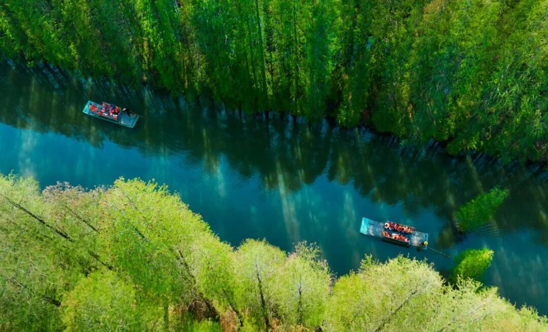 坐一叶竹筏,在水杉林中缓缓穿行,阳光从树冠的缝隙筛下来,在水面投下斑驳的光影。竹筏划过,水波轻漾,整片森林在身后慢慢退去。
