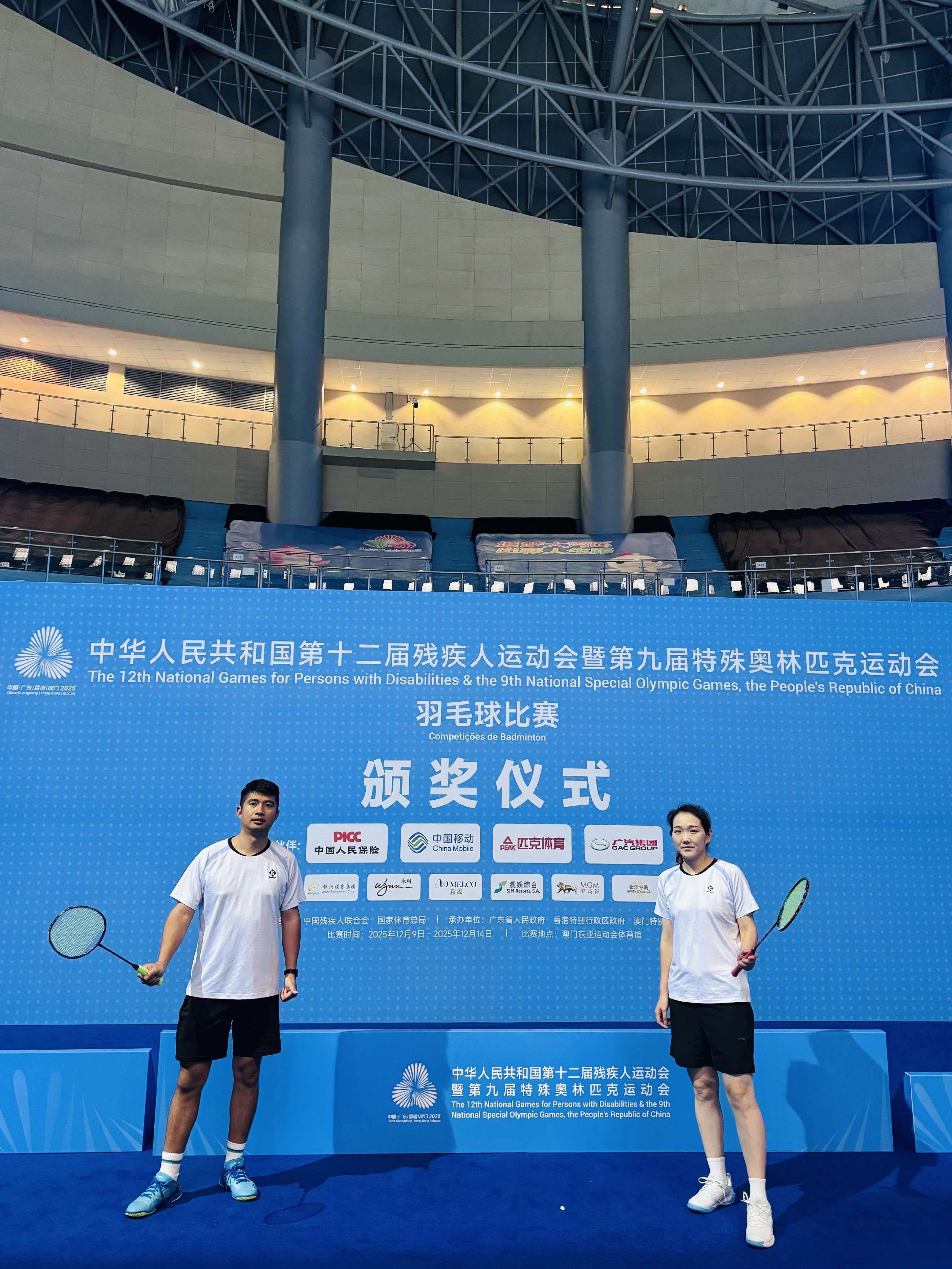 2025年12月12日,全国残运会澳门羽毛球馆内,灯光如昼。来自江苏昆山的聋人运动员张卫东凝神屏息,视线紧紧锁住对手扬起的球拍。在他无声的世界里,羽毛球从来不是靠听觉判断的运动。当球被击出的瞬间,他锐利的双眼已预判出那道白色轨迹。运动员看台上,妻子陈兰同样目不转睛,双手下意识握紧。